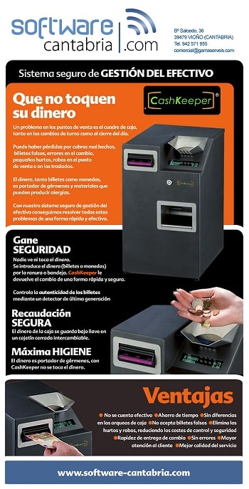 Añadimos a nuestro portfolio de productos el sistema de gestión segura de efectivo Cashkeeper que enlazado con el software de TPV táctil de Techni-web comercializado por softwarecantabria.cantabrianegocios.es facilita la gestión del efectivo. ¡¡ Que no toquen su dinero !!.